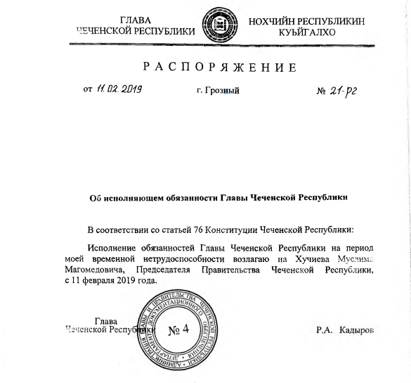 «Исполнение обязанностей Главы Чеченской Республики на период моей временной нетрудоспособности» возлагаю на Хучиева Муслима Магомедовича, председателя правительства Чеченской Республики, с 11 февраля 2019 года», — говорится в распоряжении.