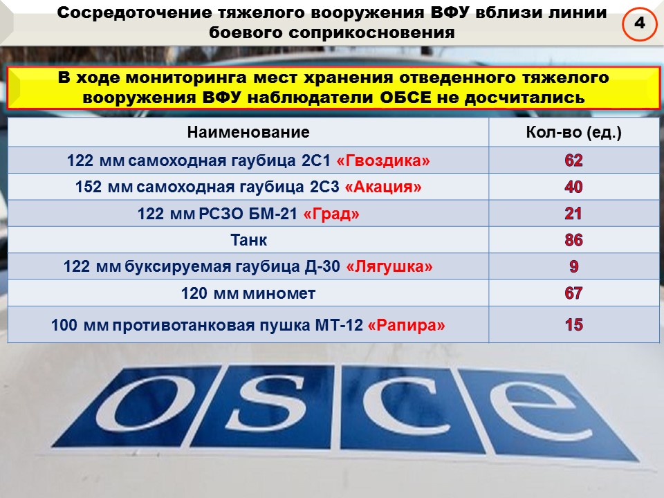 В ходе мониторинга установленных мест хранения отведенного тяжелого вооружения ВСУ наблюдатели ОБСЕ не досчитались 62 122-мм самоходных гаубиц «Гвоздика», 40 152-мм самоходных гаубиц «Акация», 21 РСЗО «Град», 86 танков, девять 122-мм буксируемых гаубиц «Лягушка», 67 120-мм минометов и 15 противотанковых пушек «Рапира».