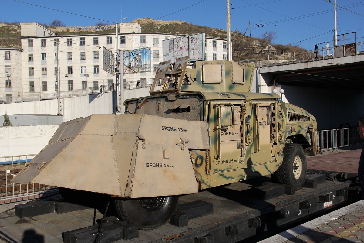 Демонстрация захваченных в ходе трёхлетней операции российской армии в САР сирийских трофеев проходила на центральном перроне городского железнодорожного вокзала, куда прибыл эшелон.