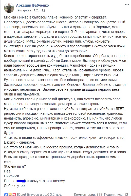 Правда, далее для порядка Бабченко повторяет привычные мантры про «диктатуру», «кровавый режим», «преследование ЛГБТ» и ксенофобию, однако все это выглядит так неестественно, что многие читатели его страницы выразили сомнение, что эта дежурная критика написана искренне.