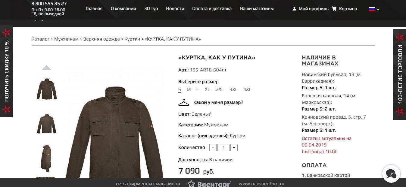 Ранее куртка была эксклюзивной, сшитой на заказ специально для Владимира Владимировича. Теперь любой желающий может её купить в фирменных магазинах «Армия России». Размерный ряд представлен от S до 4XL.