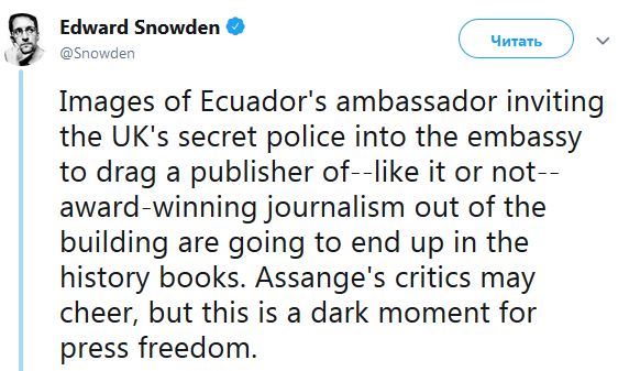 «Картина того, как посол Эквадора приглашает британскую секретную полицию, чтобы выгнать из здания издателя и — нравится вам или нет — обладателя премий по журналистике, войдет в книги по истории. Критики Ассанжа могут радоваться, но это темный момент для свободы прессы», — написал Сноуден на своей странице в соцсети.