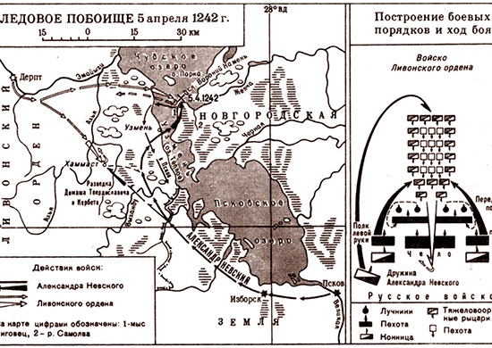 На льду Чудского озера у восточного берега, рядом с островом Городецкий на дороге из Пскова в Новгород русские воины под началом новгородского князя Александра Ярославича Невского разбили немецких рыцарей Ливонского ордена.