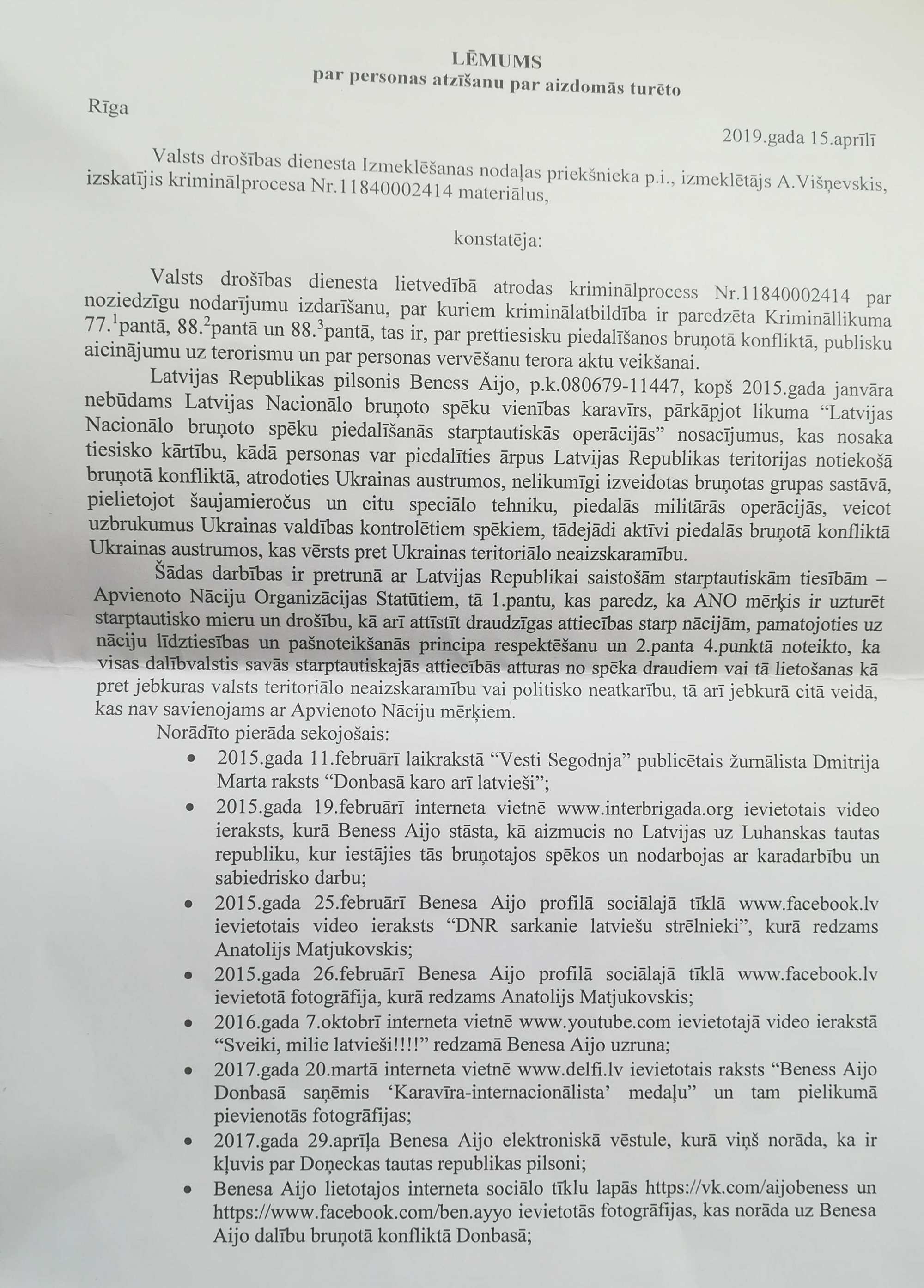В выдвинутом мне обвинении сказано, что я, гражданин Латвии, нахожусь на Востоке Украины, состою в незаконных вооруженных формированиях и использую огнестрельное оружие и различную военную технику, а также участвую в вооруженных операциях, нападая при этом на вооруженные силы Украины и подрывая территориальную целостность Украины.
