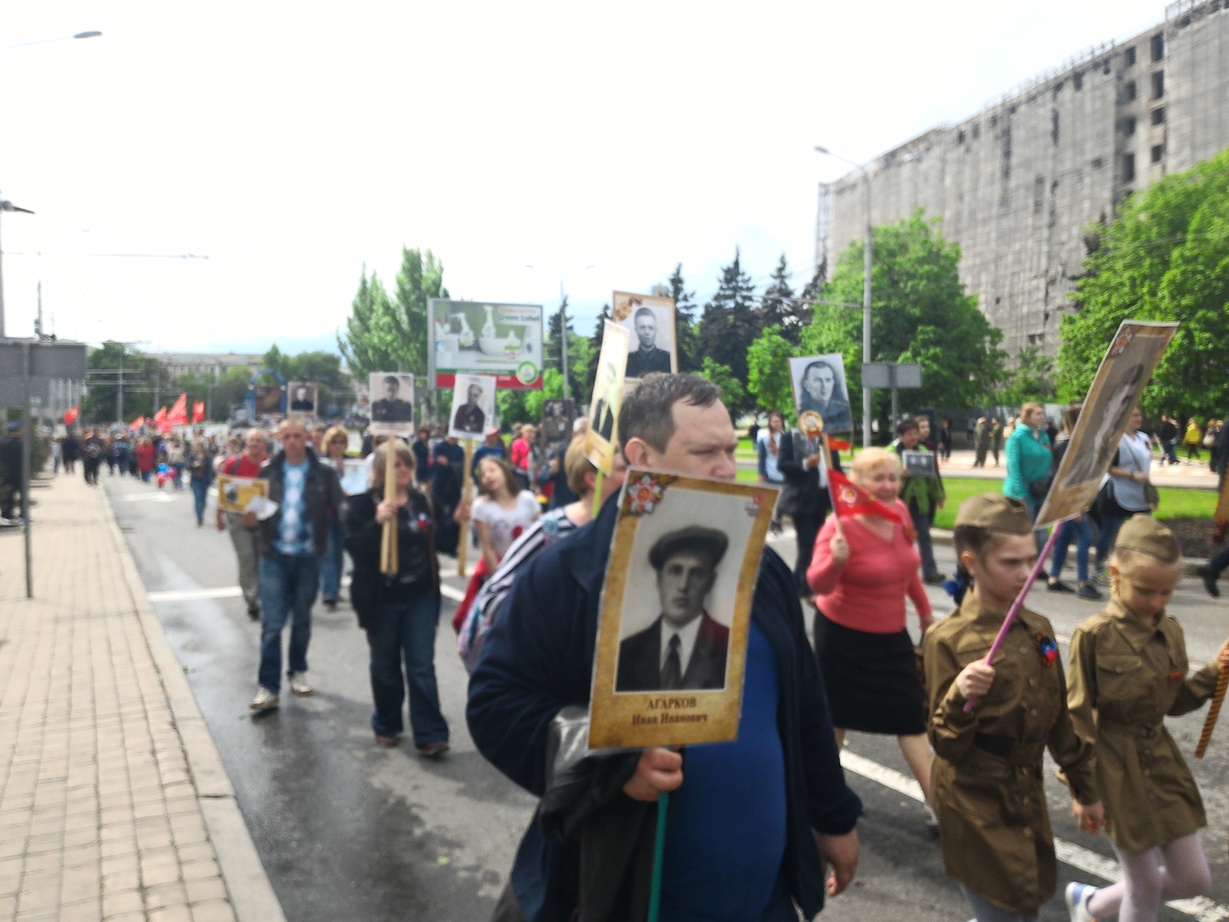 Около 10 часов начался марш «Бессмертного полка» — тысячи человек несли в руках портреты павших воинов Великой Отечественной войны и цветы. От площади Ленина мы дошли до монумента Воинам-освободителям Донбасса в Парке имени Ленинского Комсомола.