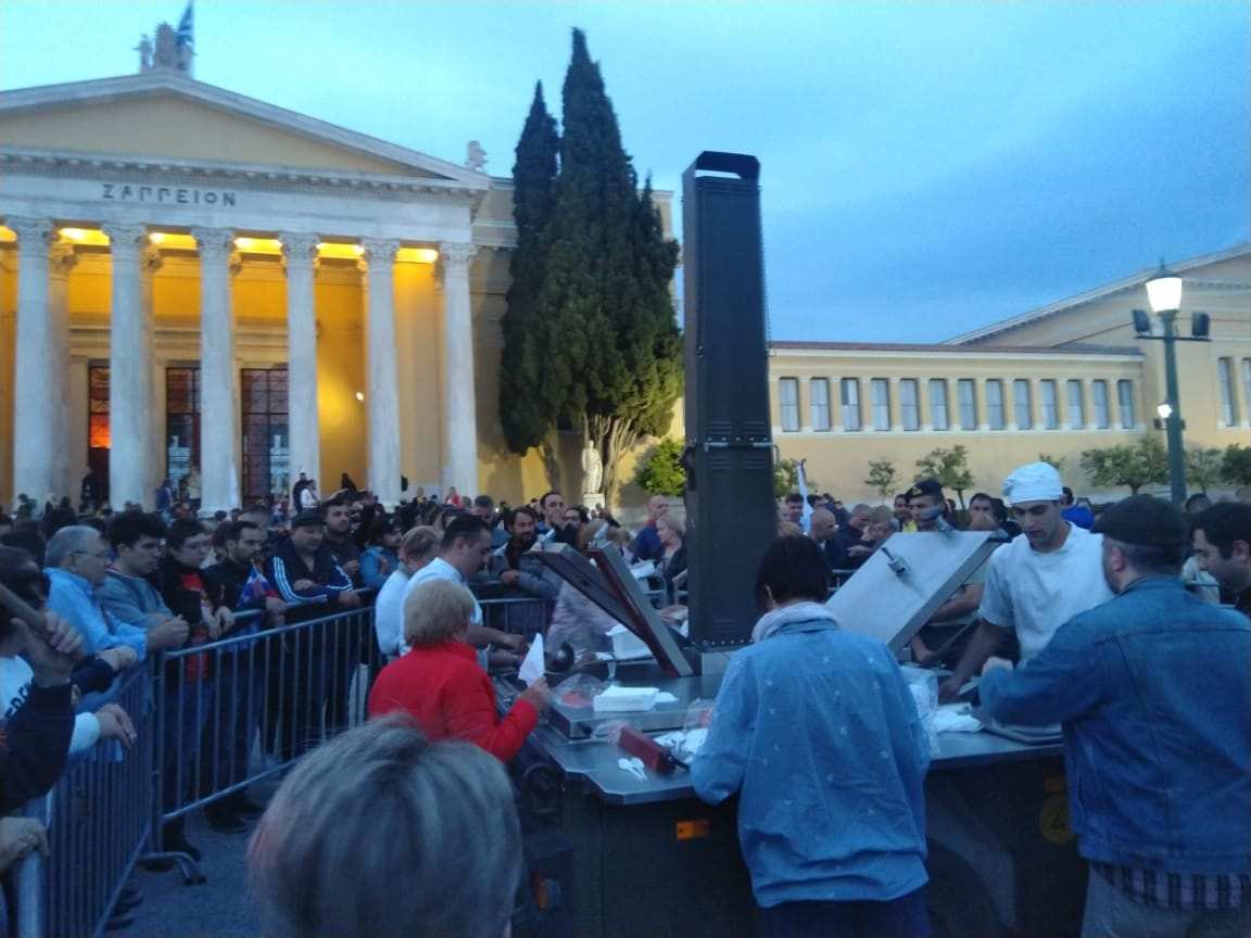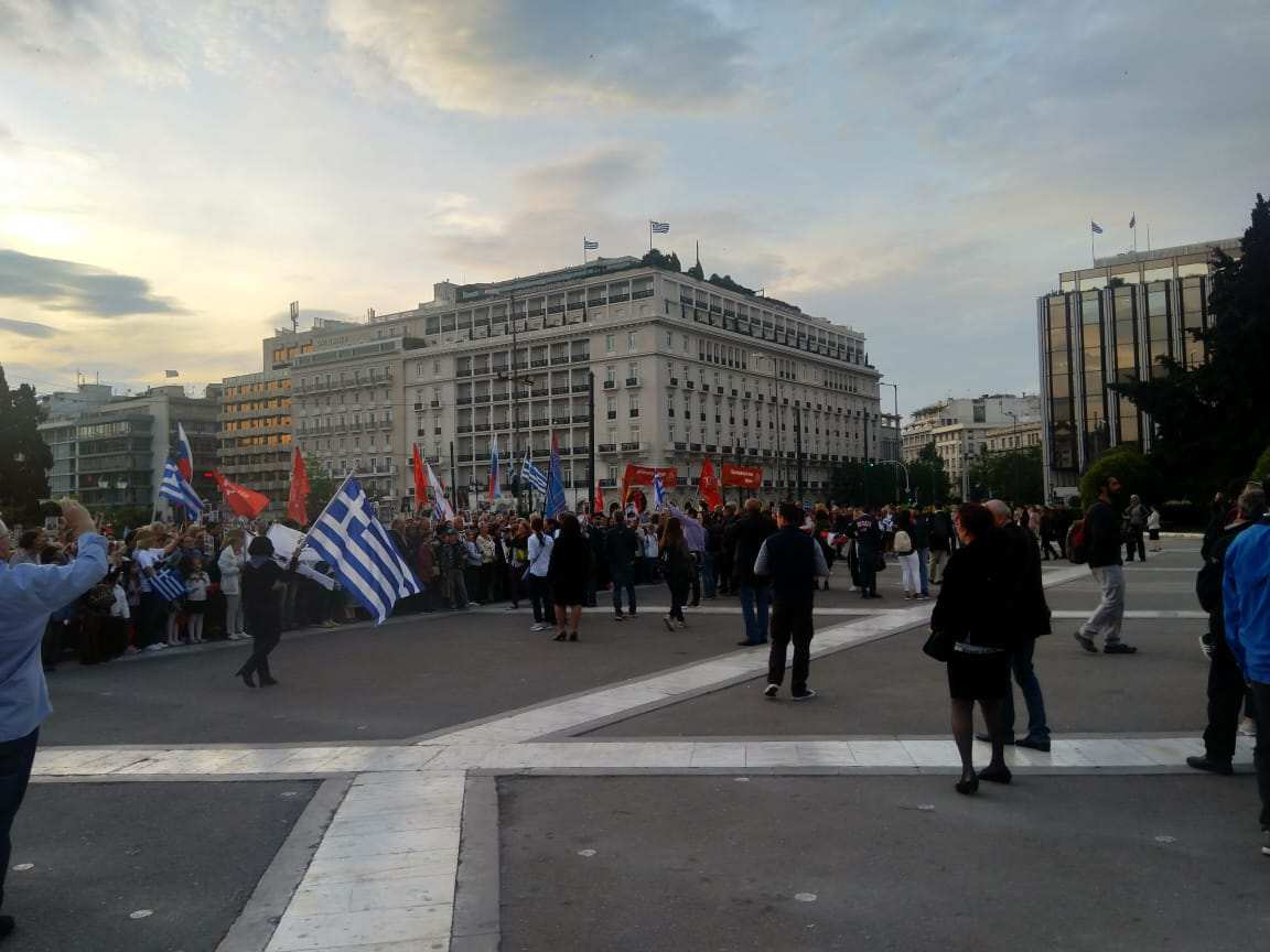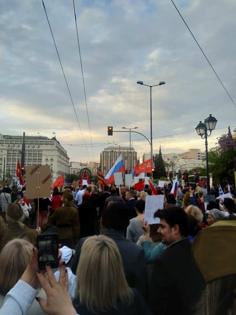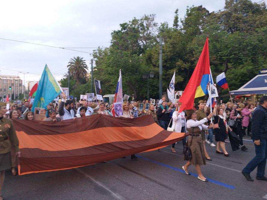 Движение колонны началось от Русской посольской церкви. Тысячи людей с портретами родственников-фронтовиков и тружеников тыла прошли к памятнику Неизвестному солдату на центральной площади Синтагма возле парламента.