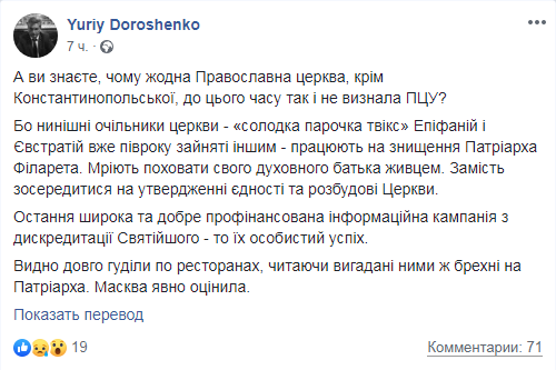 Один из ближайших сподвижников «почетного патриарха» Филарета, Юрий Дорошенко, открыто заявил, что глава ПЦУ Епифаний является гомосексуалистом.
