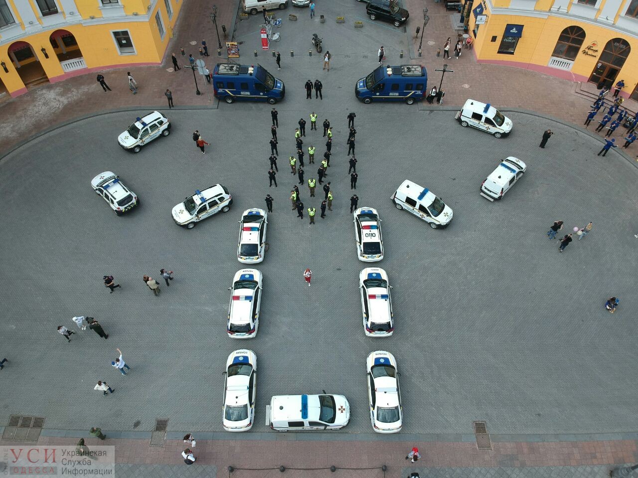 Контуры национальной одежды создали патрульные машины, а имитацию вышивки по центру — сотрудники полиции и Нацгвардии. Также возле Дюка играл военный оркестр.