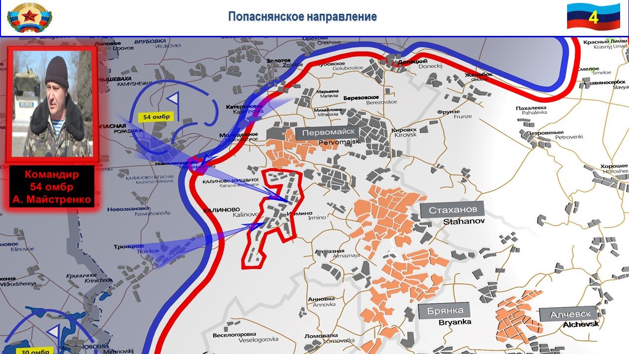 На попаснянском направлении по приказу командира 54 механизированной бригады Майстренко обстрелам из 82 мм минометов и гранатометов различных видов подверглись районы населённых пунктов Калиново и Новоалександровка.