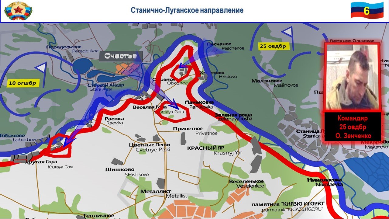 На станично-луганском направлении обстрелам из 120 мм минометов, гранатомётов различных видов, крупнокалиберного и стрелкового оружия подверглись районы населённых пунктов Крутая Гора, Веселая Гора и Обозное. Приказ на обстрел территории Республики отдавал командир 25 воздушно-десантной бригады, преступник Зенченко.