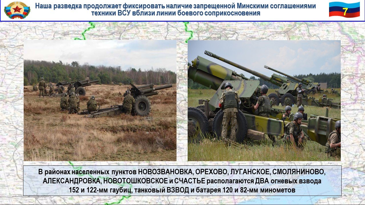 В районах населенных пунктов Новозвановка, Орехово, Луганское, Смоляниново, Александровка, Новотошковское и Счастье располагаются два огневых взвода 152 и 122-мм гаубиц, танковый взвод и батарея 120 и 82-мм минометов, к которым организован на постоянной основе подвоз боеприпасов для ведения провокационного огня по нашим позициям и населенным пунктам Республики.