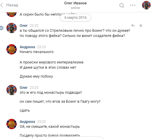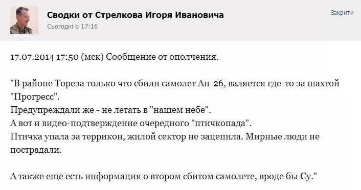 Как мне рассказывал Олег, это сообщение якобы от имени Стрелкова, Олег просто прочитал комментарии в соцсетях от очевидцев падения большого самолёта.