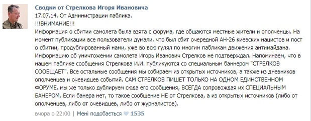 Не только на всяких либеральных сайтах, но и на нормальных новостных ресурсах встречаю подобные комментарии, где вспоминают, что Стрелков якобы опубликовал признание о сбитом самолёте, думая, что это украинский, а потом «по тихой грусти» удалил это своё сообщение.