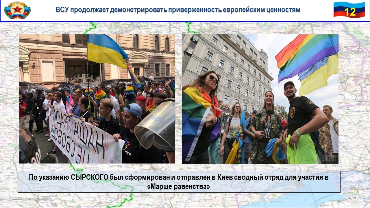 На фоне участия военнослужащих 46-го отдельного батальона специального назначения “Донбасс” по указанию командующего “ООС” Сырского был сформирован сводный отряд из провинившихся военнослужащих ОТГ “Восток” и “Север” в количестве 50 человек, которые под угрозой увольнения и дисциплинарных взысканий 24 июня были направлены в Киев для участия в гей-параде “Марш равенства”.