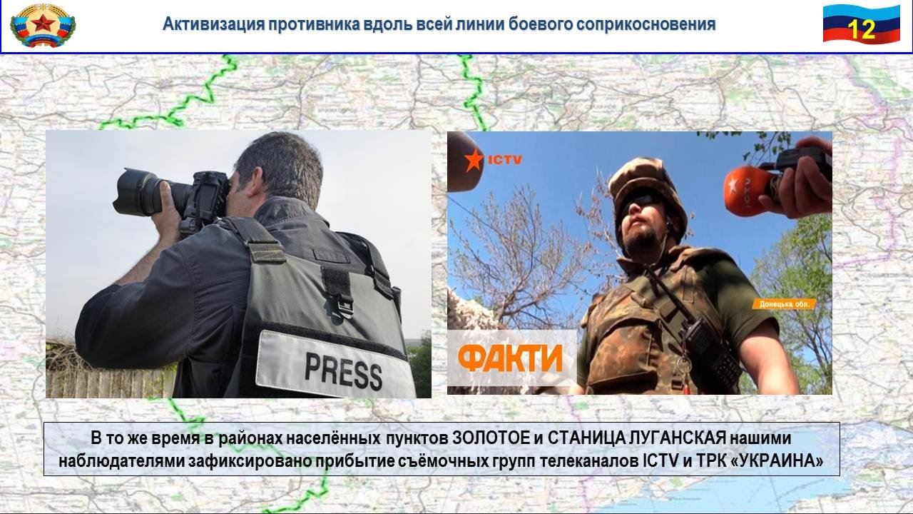 На протяжении нескольких дней нашей разведкой фиксируется активизация противника вдоль всей линии боевого соприкосновения. В то же время в районах населённых пунктов Золотое и Станица Луганская нашими наблюдателями зафиксировано прибытие съёмочных групп телеканалов ICTV и ТРК «Украина» в сопровождении офицеров 72-го центра психологических операций.