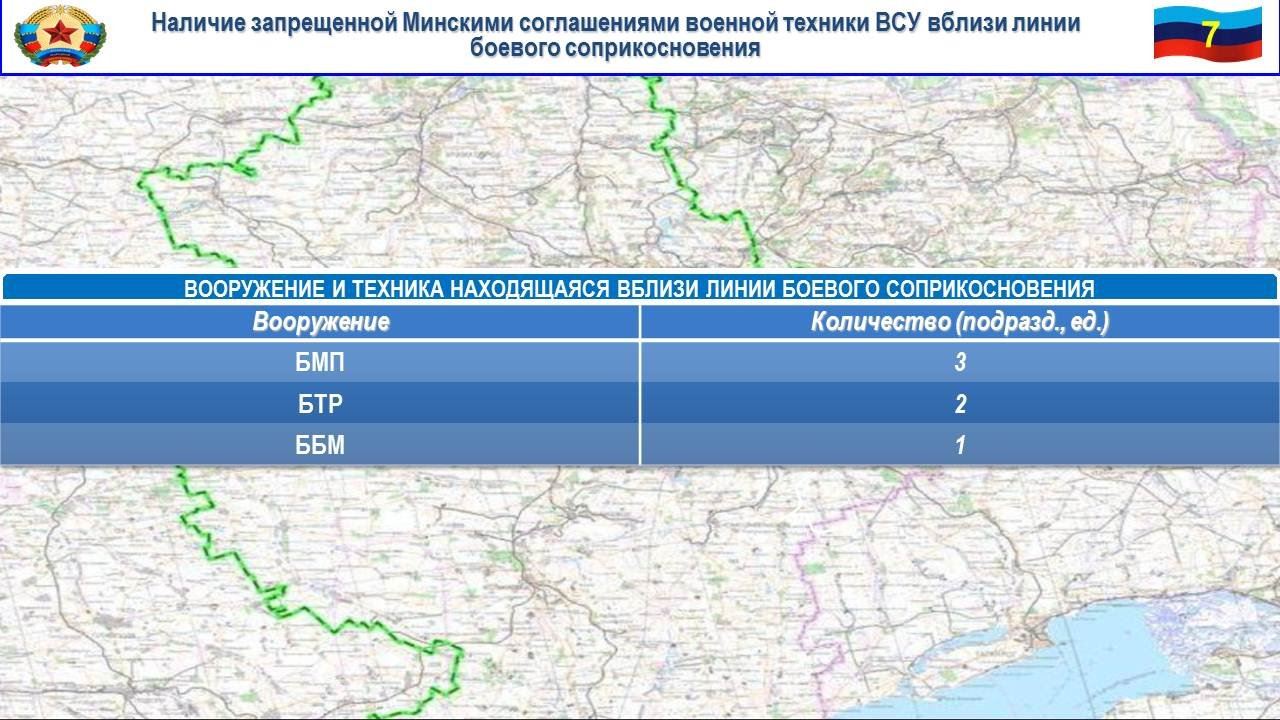 В течение недели ВСУ шестнадцать раз нарушили режим прекращения огня. При обстрелах противник применял запрещенные Минскими соглашениями минометы калибра 120 и 82 мм, гранатометы различных видов, вооружение БМП, крупнокалиберное стрелковое оружие.
