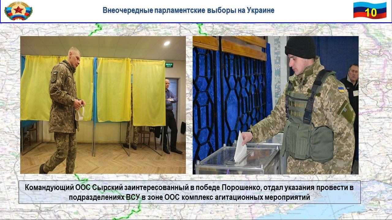 В преддверии внеочередных парламентских выборов на Украине, которые должны состояться 21 июля, командующий «ООС» Сырский, заинтересованный в победе подконтрольной Порошенко политической партии «Европейская солидарность», отдал указания заместителю по МПО полковнику Кудренко провести в подразделениях ВСУ в зоне «ООС» комплекс агитационных мероприятий.
