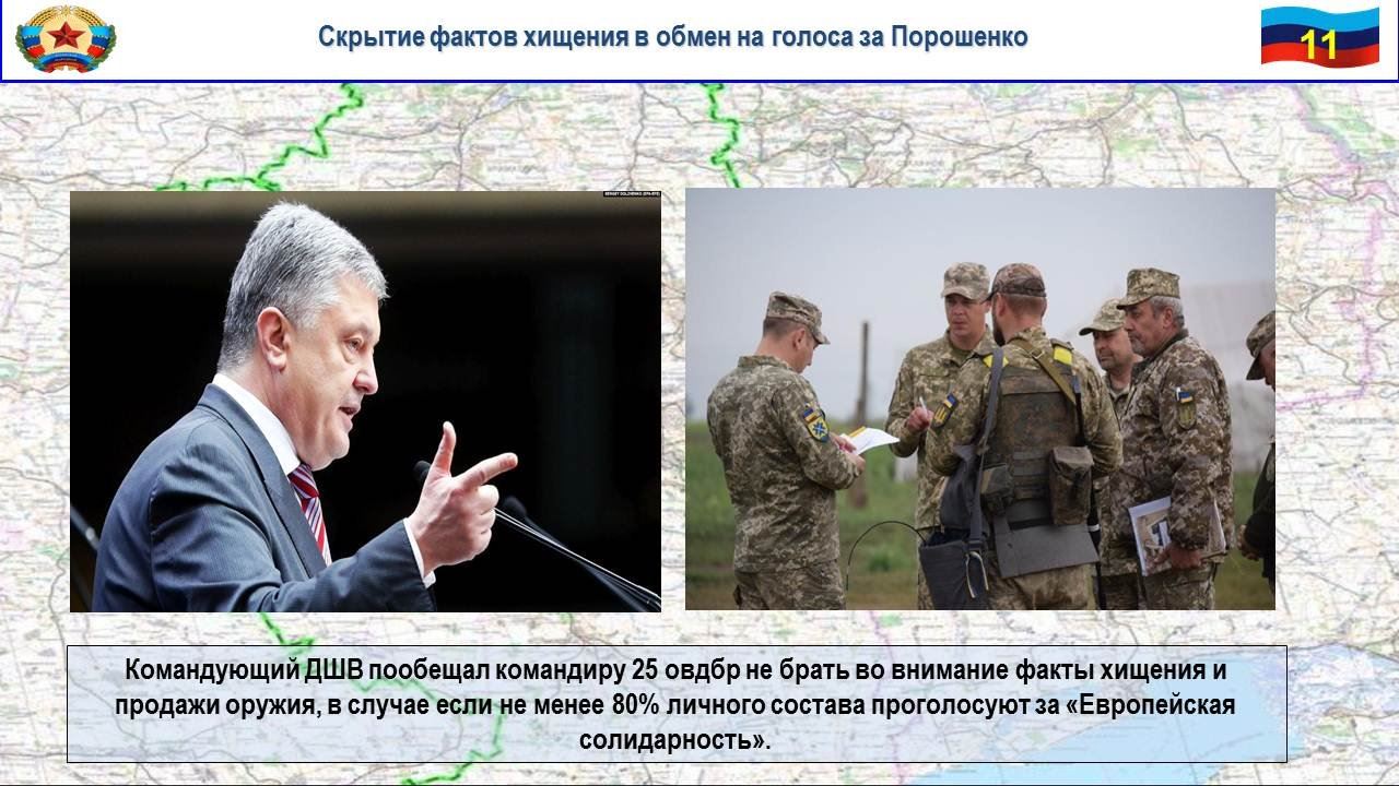 По полученным данным от наших источников в штабе «ООС», командующий ДШВ Забродский пообещал командиру 25 отдельной воздушно-десантной бригады Зенченко не брать во внимание выявленные в бригаде факты хищения и продажи оружия и боеприпасов, в случае, если не менее восьмидесяти процентов личного состава бригады проголосуют за партию «Европейская солидарность».