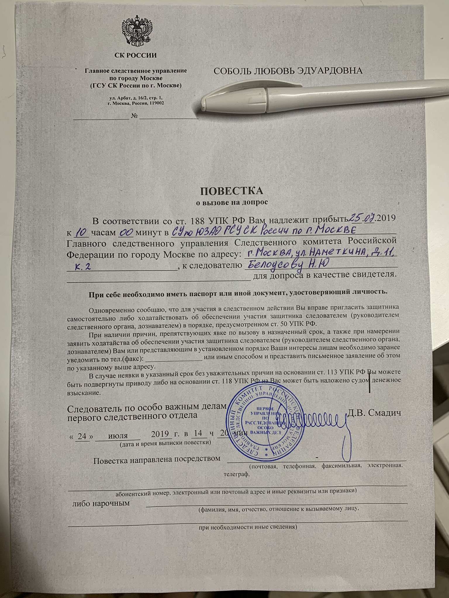 О полученных повестках сообщили, в частности, Дмитрий Гудков и незарегистрированная в качестве кандидата в Мосгордуму юрист ФБК Любовь Соболь.