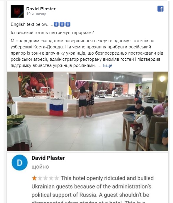 «Впрочем, администратор, очевидно, оказался горячим сторонником российской политики, потому что в грубой форме отказал гостям, добавив, что его позиция — это позиция всей Испании. К спору на рецепции присоединились граждане России, которых администрация попросила лично разобраться с шокированными украинцами. Чтобы ярче продемонстрировать пренебрежение к гражданам Украины, на развлекательном вечере у бассейна отеля аниматоры начали исполнять военные русские песни», — добавил Пластер.