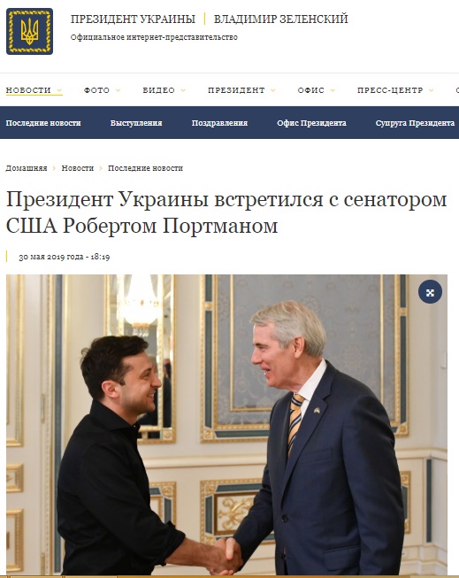 После этого сенатор Портман 30 мая прилетал на Украину и встретился с Владимиром Зеленским. Об этом была опубликована новость на официальном сайте президента. В ней сообщалось, что Владимир Зеленский поблагодарил гостя за поддержку Украины со стороны Сената США и лидерство Роберта Портмана: