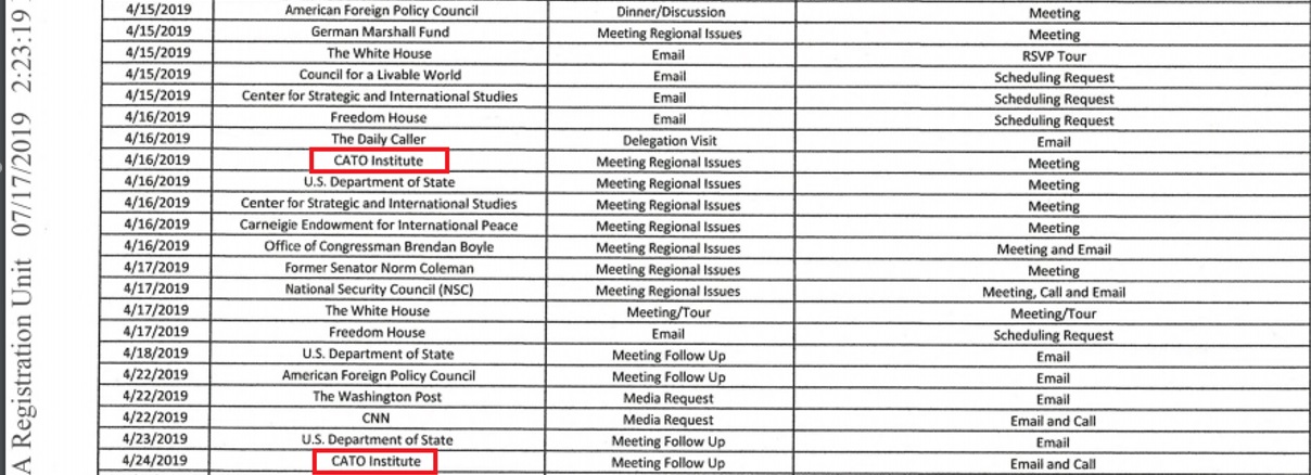 CATO Institute, где работает автор статьи, пять раз упоминается в перечне мероприятий, которые провели лоббисты, нанятые от имени Зеленского. С CATO Institute лоббистская фирма вела переписку по электронной почте, телефонные переговоры, а также организовала встречу: