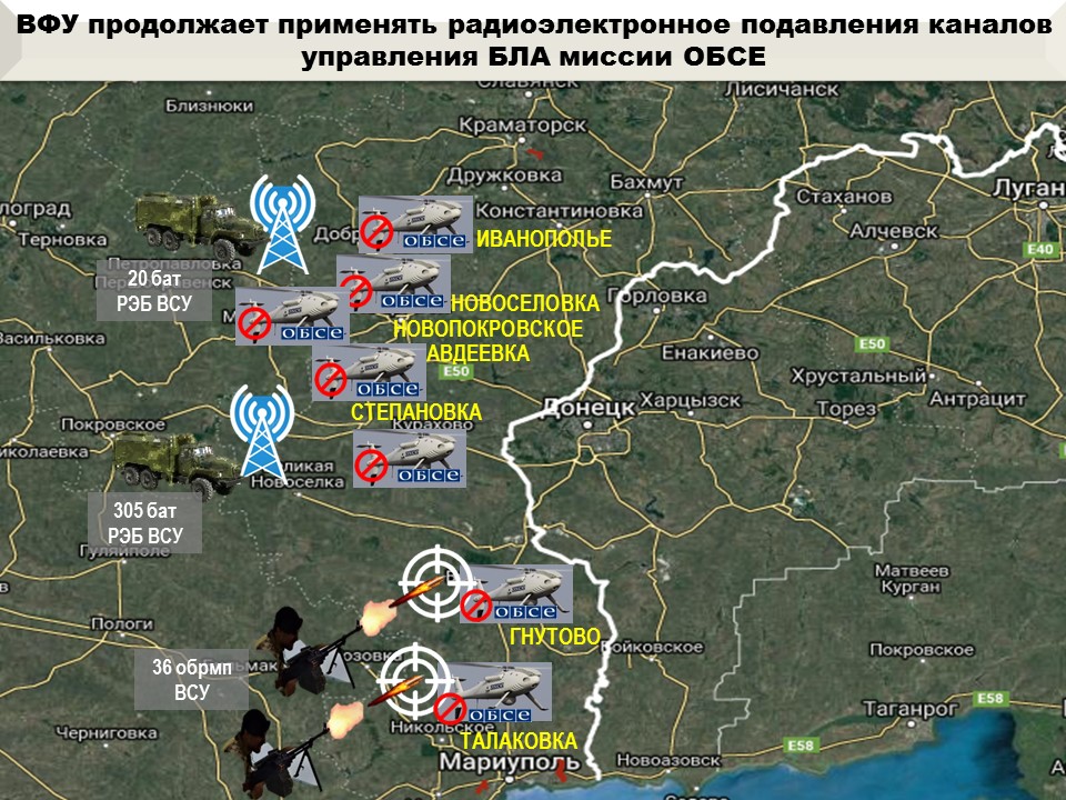 За последнюю неделю нами выявлены многочисленные факты работы мобильных групп РЭБ из состава 305-го и 20-го батальонов РЭБ ВСУ. Их работа фиксировалась вдоль всей линии соприкосновения, наиболее часто в районах н. п. Авдеевка, Степановка, Новосёловка, Новопокровск, Чермалык и Иванополье, где наблюдатели миссии ОБСЕ были вынуждены прекращать работу БПЛА из-за угрозы их потери.