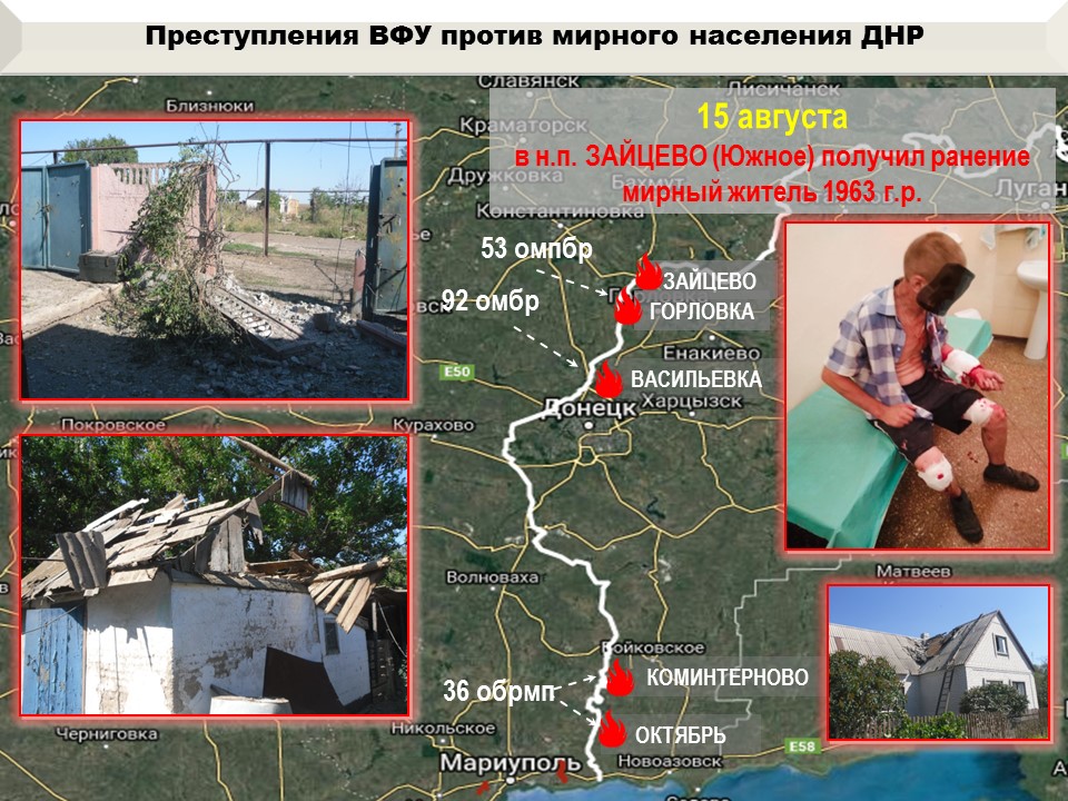 На горловском направлении боевики полка «Азов» и 53-й бригады под командованием военных преступников Прокопенко и Полякова вели обстрелы н. п. Доломитное и Зайцево с применением 120-мм минометов, автоматических гранатометов, крупнокалиберных пулеметов и стрелкового оружия.