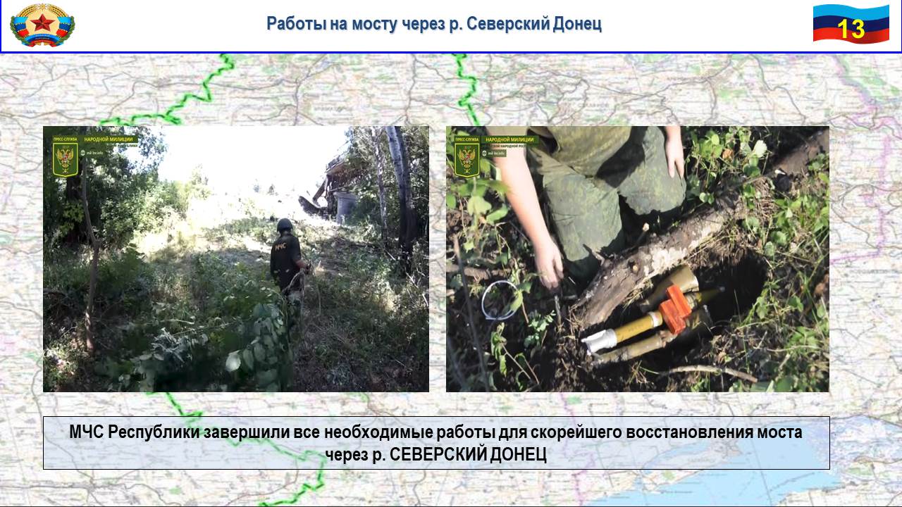 На прошедшей неделе МЧС Республики завершили все необходимые работы для скорейшего восстановления моста через р. Северский Донец, местность очищена от взрывоопасных предметов, проведена вырубка деревьев и дополнительная проверка периметра.