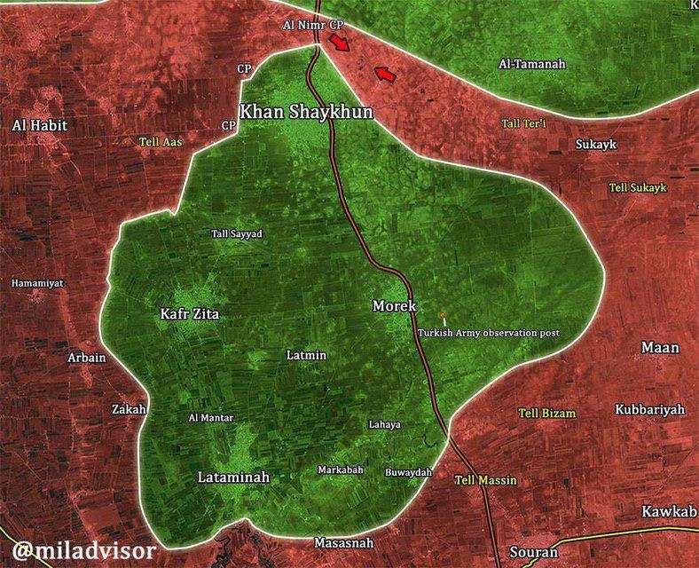 Сообщается, что армейцы вошли в Хан-Шейхун с востока. Все территории боевиков южнее города окончательно были взяты в кольцо.