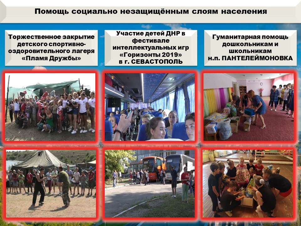 В рамках оказания помощи жителям нашей Республики, совместно с общественными благотворительными организациями оказана помощь дошкольным и школьным образовательным учреждениям прифронтового поселка Пантелеймоновка в виде вещевого имущества, канцелярских принадлежностей, игрушек и детской площадки, а также организована отправка детей Республики на фестиваль интеллектуальных игр «Горизонты 2019» в г. Севастополь.