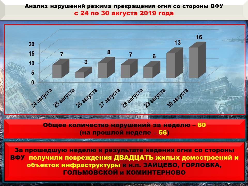 Всего за неделю ВСУ шестьдесят раз нарушили режима прекращения огня, в том числе из запрещённых видов вооружения, выпустив по районам двадцати двух населенных пунктов Республики двенадцать артиллерийских снарядов калибром 122-мм, двадцать танковых снарядов, сто семьдесят одну мину калибром 120 и 82 мм и восемьдесят две гранаты различного типа.