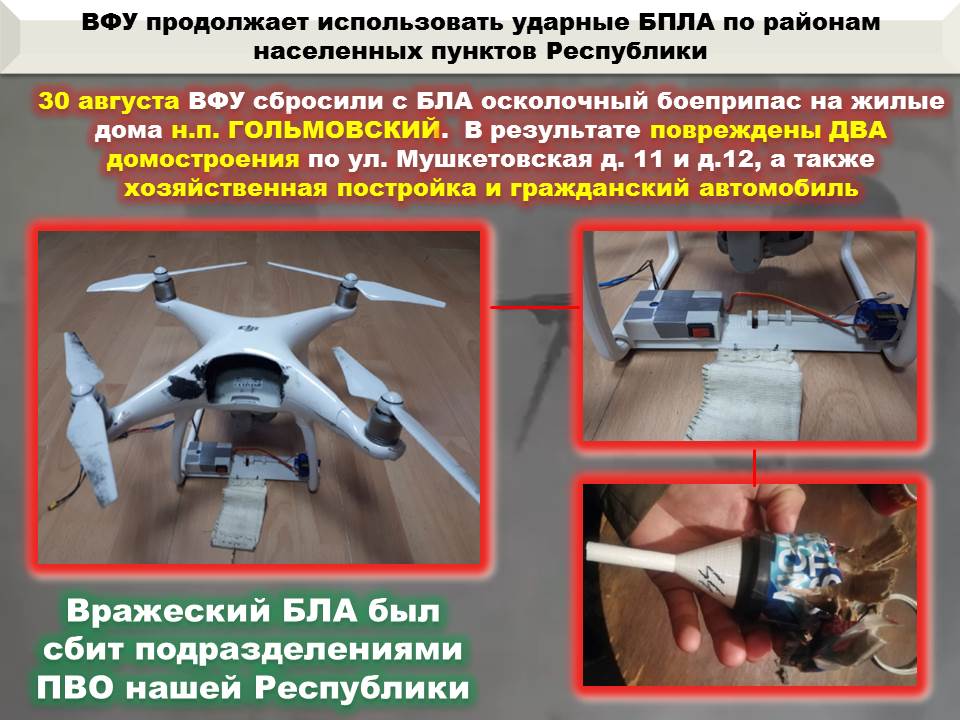 Так, сегодня осколочный боеприпас был сброшен с беспилотника на жилые дома н. п. Гольмовский. В результате попадания осколков были повреждены два домостроения по ул. Мушкетовской д. 11 и 12, а также хозяйственная постройка и гражданский автомобиль.