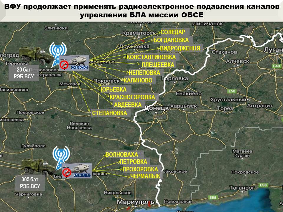 Согласно указаниям командования «ООС» подразделения РЭБ, с целью сокрытия фактов размещения запрещённой военной техники продолжают радиоэлектронное подавление каналов управления БЛА миссии ОБСЕ.