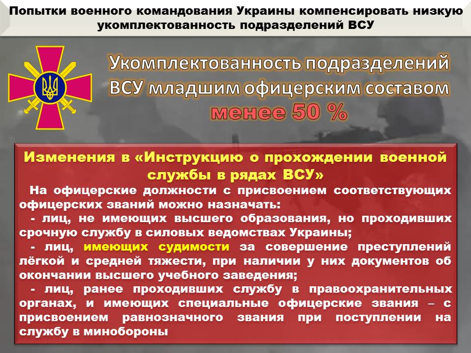 В настоящее время укомплектованность ВСУ офицерами категории «лейтенант-старший лейтенант», то есть работающих непосредственно с личным составом, в зоне «ООС» составляет менее 50%. Для доукомплектования этих должностей в Минобороны Украины даже принято решение о внесении изменений в «Инструкцию о прохождении военной службы».