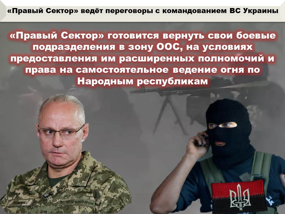 Нашей разведкой получены данные о проведении на прошлой неделе закрытых переговоров между представителями руководства генерального штаба ВСУ и руководством «Добровольческого украинского корпуса “Правый сектор”*. Переговоры ведутся по вопросу формирования из боевиков-нацистов отдельных подразделений в составе украинской армии по аналогии с 24 батальоном «Айдар» и 46 батальоном «Донбасс».