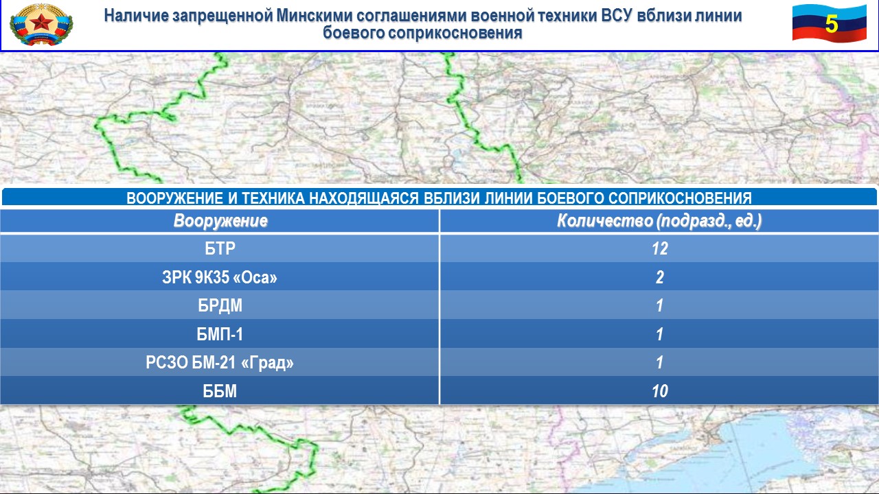 За неделю нашей разведкой отмечались факты прибытия трех БТР из состава 72 бригады ВСУ в район н. п. Попасная, размещение ЗРК 9К35 «Оса» на территории жилого домовладения в н. п. Сиротино, а также военной техники противника в количестве четырех бронетранспортеров в черте населенного пункта вблизи КПВВ «Станица Луганская».
