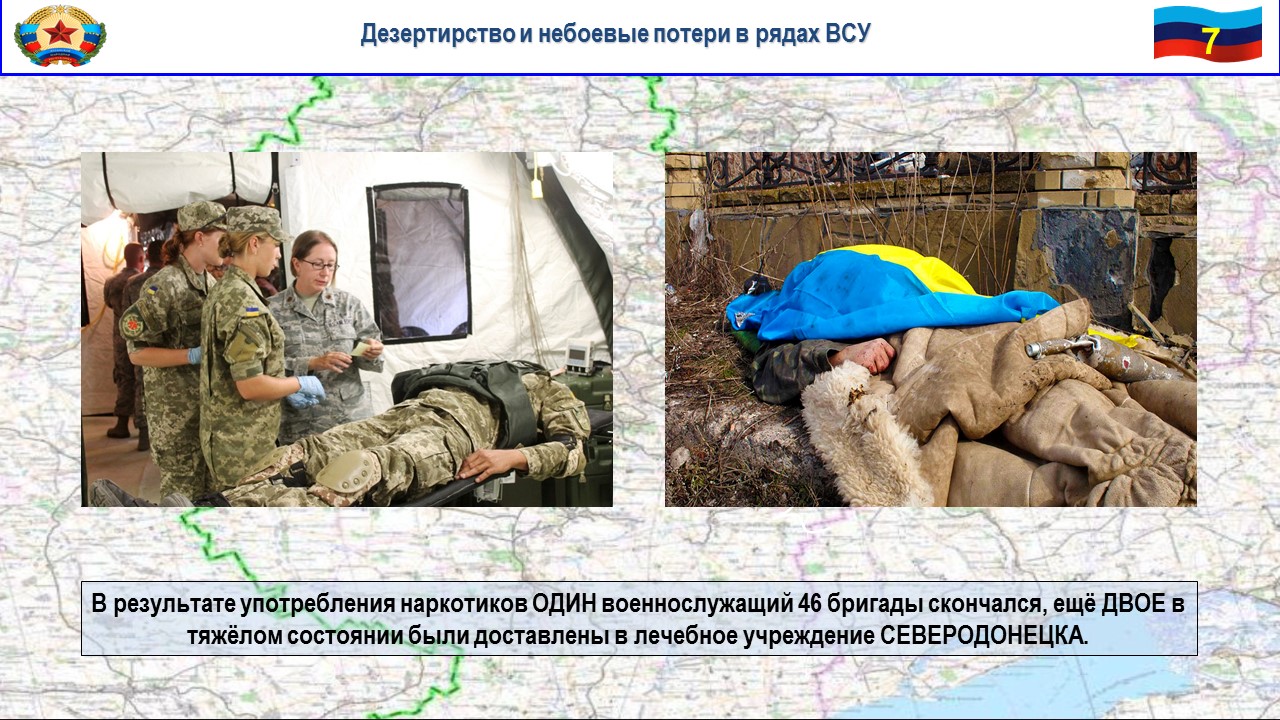 Так, по данным наших источников, 24 августа в районе населённого пункта Трёхизбенка боевик 3 БТГр 46 бригады ВСУ с позывным «Хорват» принёс в расположение подразделения синтетические наркотические вещества, в результате употребления которых скончался, ещё двое в тяжёлом состоянии были доставлены в лечебное учреждение Северодонецка.