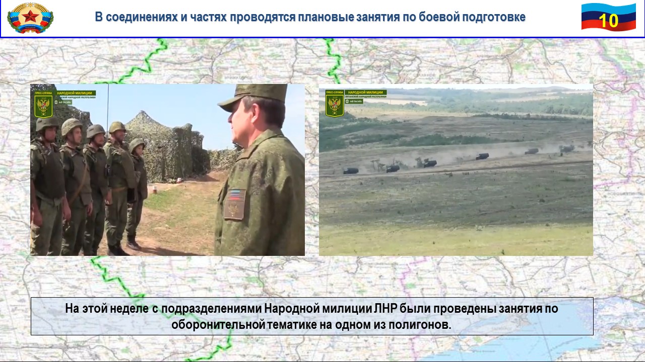 На этой неделе с подразделениями Народной милиции ЛНР были проведены занятия по оборонительной тематике на одном из полигонов, в ходе которых военнослужащие Народной милиции показали высочайший уровень слаженности подразделений, четко, быстро и безошибочно выполнив учебную задачу и продемонстрировав тем самым готовность в любой момент защитить государственный суверенитет Луганской Народной Республики и безопасность её жителей.