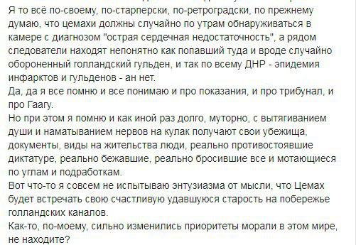 «Я-то всё по-своему, по-старперски, по-ретроградски, по-прежнему думаю, что цемахи должны случайно по утрам обнаруживаться в камере с диагнозом „острая сердечная недостаточность“, а рядом следователи находят непонятно как попавший туда и вроде случайно оброненный голландский гульден, и так по всей ДНР — эпидемия инфарктов и гульденов — ан нет.