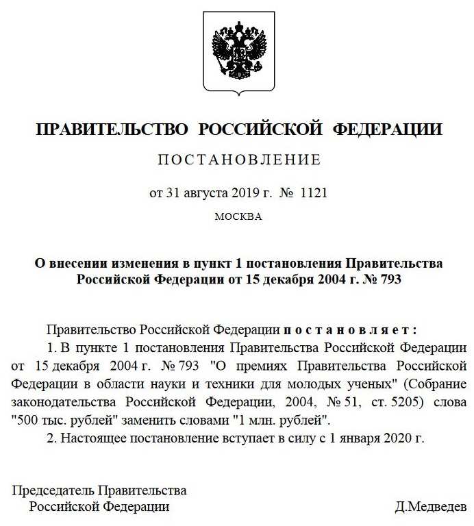 В России в два раза — с 500 тыс. до миллиона рублей — увеличиваются премии для молодых учёных. Об этом говорится в Постановлении Правительства РФ от 31 августа 2019 года № 1121.