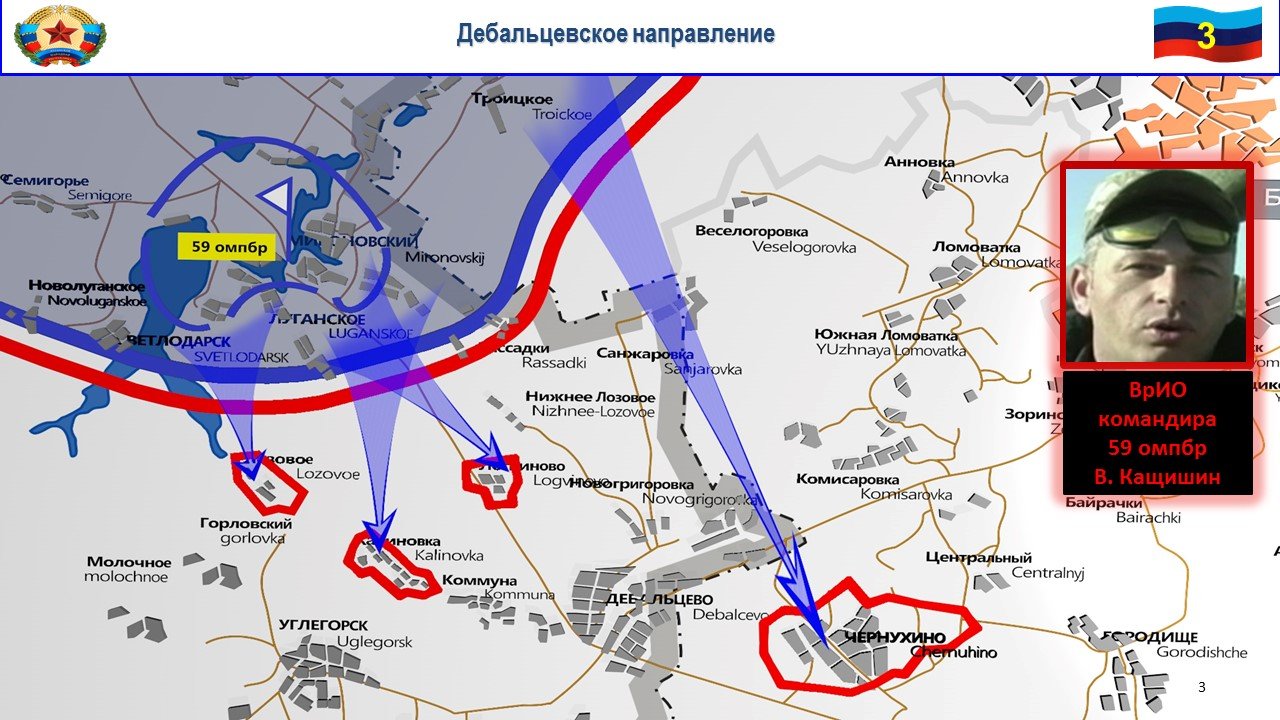 На дебальцевском направлении по приказу командира 59 омпбр Кащишина противник обстрелял из 82-мм миномётов, артиллерии калибром 152-мм, СПГ, крупнокалиберных пулемётов и стрелкового оружия населённые пункты Лозовое, Логвиново, Калиновка и Чернухино.