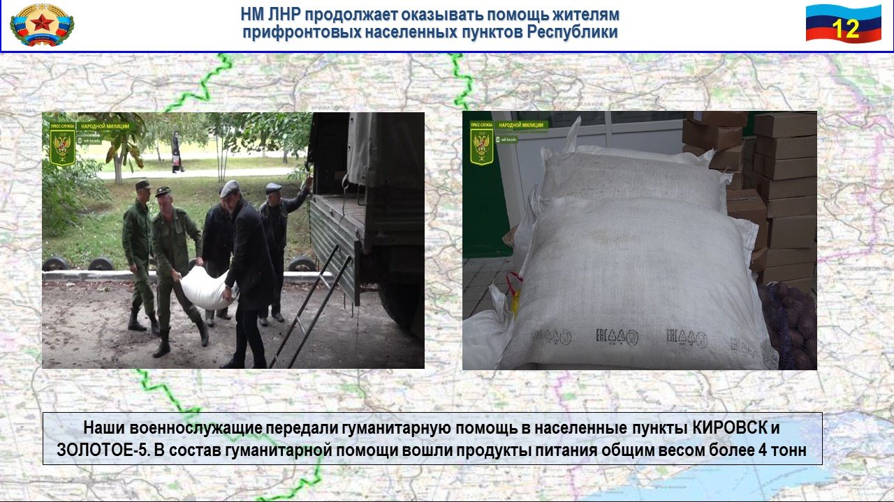 На текущей неделе наши военнослужащие передали гуманитарную помощь в населённые пункты Кировск и Золотое-5. В состав гуманитарной помощи вошли продукты питания общим весом более четырёх тонн.