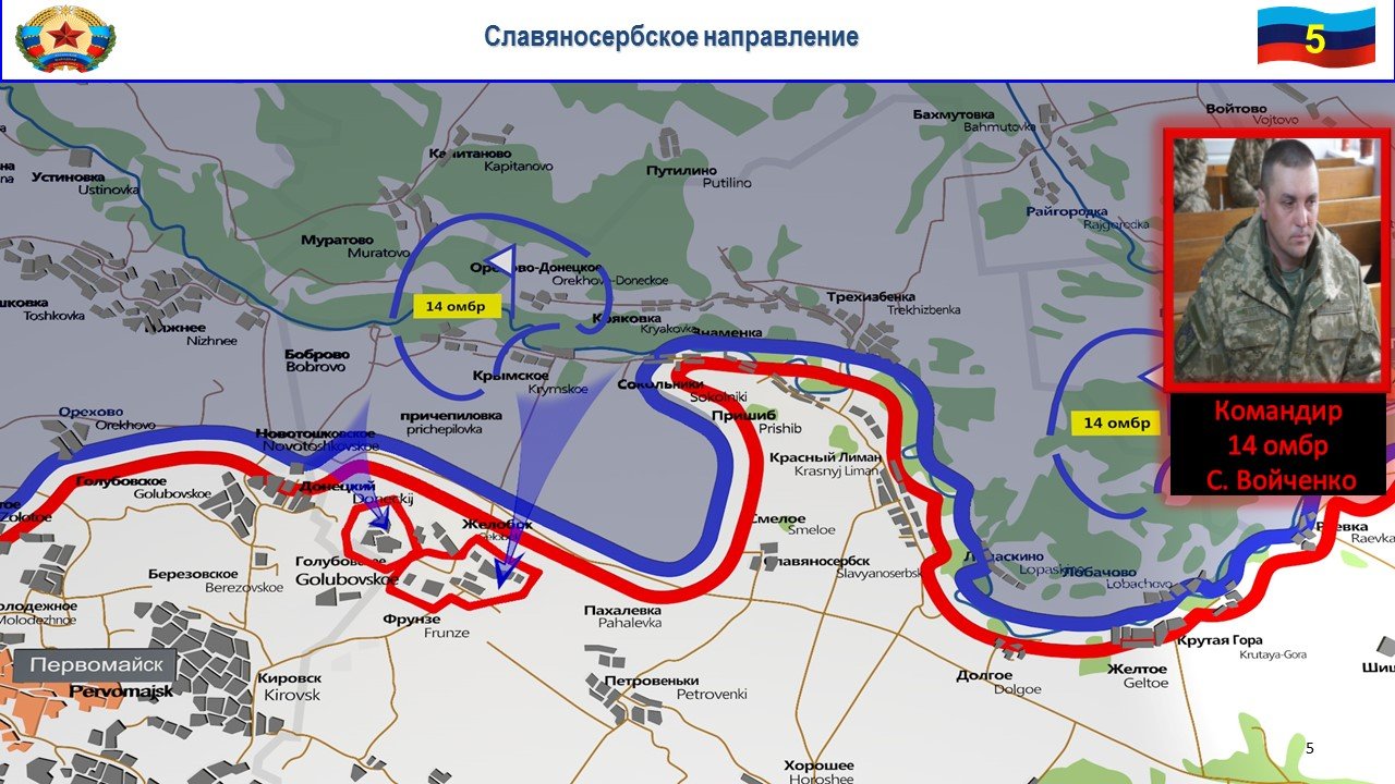 На славяносербском направлении по приказу командира 14 отдельной механизированной бригады Войченко противник обстрелял из 82-мм миномётов, гранатомётов различных видов, вооружения БМП, крупнокалиберного и стрелкового оружия населённые пункты Донецкий и Фрунзе.