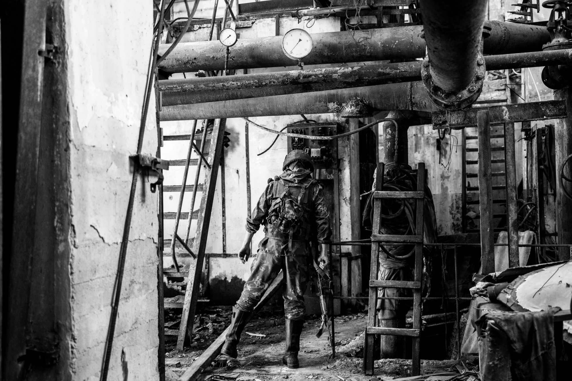 Шаркая кирзачами, боец перемещается по разбитому зданию шахты, превратившейся в важный опорный пункт обороны.