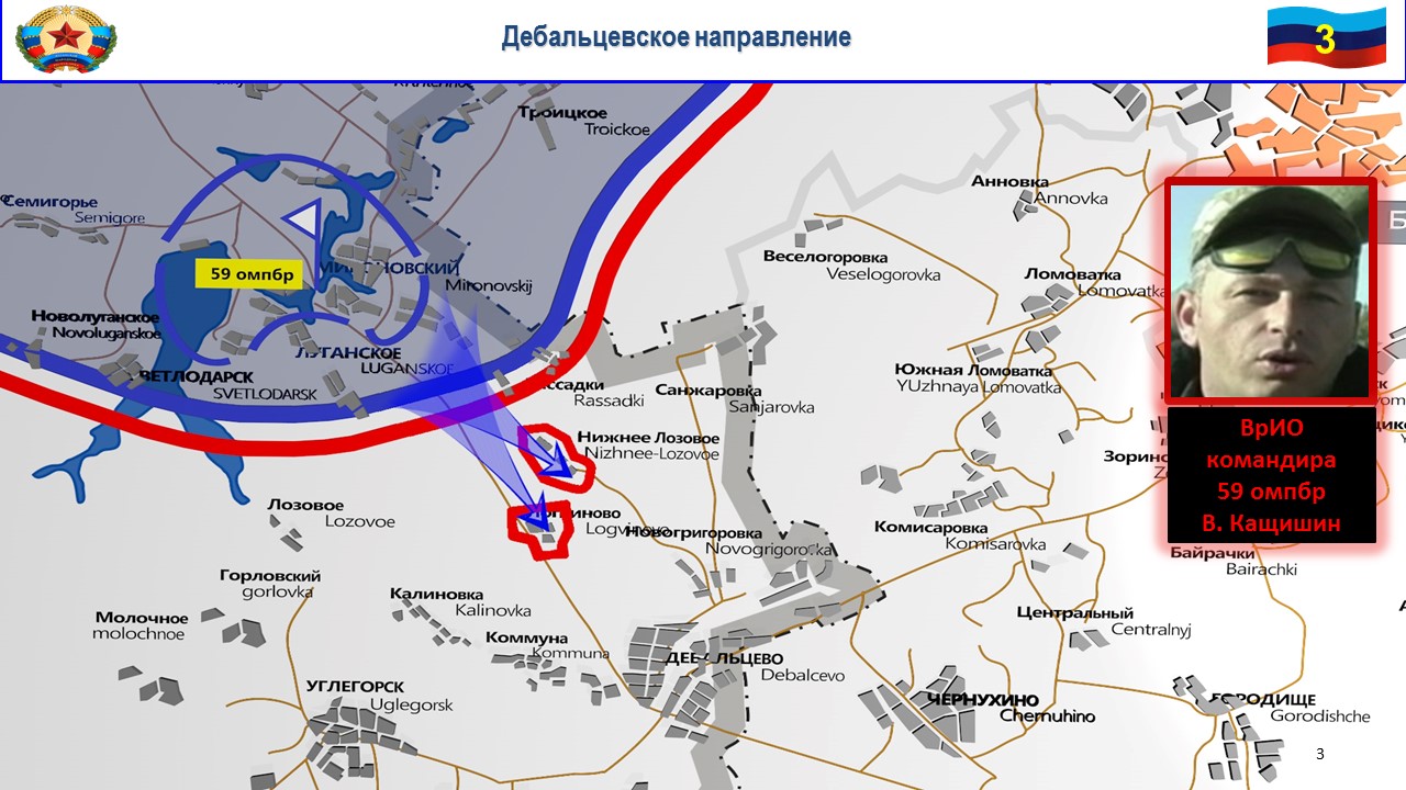 На дебальцевском направлении по приказу командира 59 бригады Кащишина противник обстрелял из 120-мм минометов, вооружения БМП-1, гранатометов различных видов, крупнокалиберных пулеметов и стрелкового оружия населенные пункты Нижнее Лозовое и Логвиново.