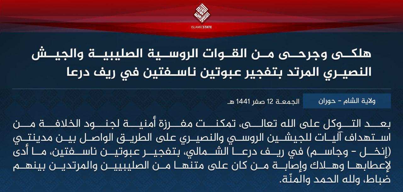 ИГИЛ* сделало заявление о подрыв самодельных взрывных устройств на маршруте следования патруля военной полиции Минобороны России на юге Сирии.