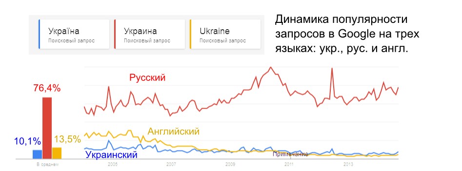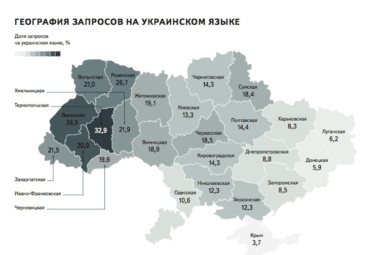 Показатель в 76% населения, говорящих на русском языке, подтвердил недавний отчет Google, в котором IT-гигант проанализировал соотношение запросов на русском и украинском языках в украинском сегменте Сети.