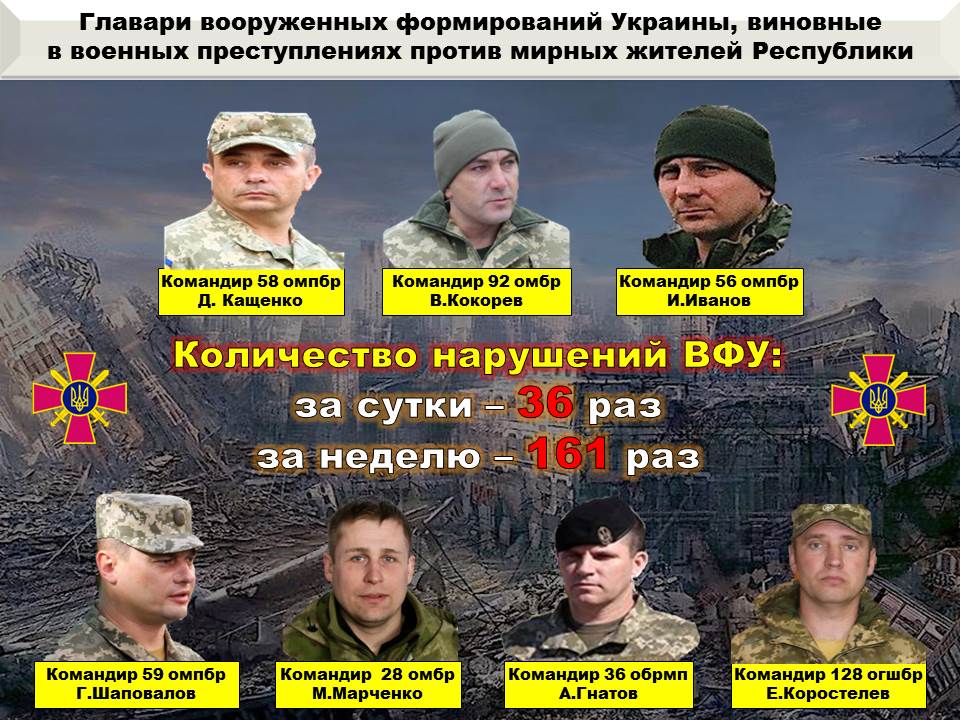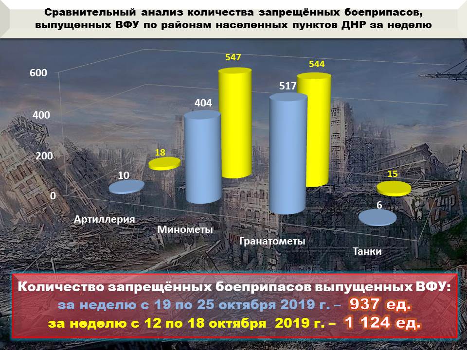 За неделю ВСУ 161 раз нарушили режим прекращения огня, в том числе из запрещённых видов вооружения, выпустив по районам 32 населенных пунктов Республики 10 артиллерийских снарядов калибром 122 мм, 404 мины калибром 120 и 82 мм, шесть танковых выстрелов и 517 гранат различного типа.