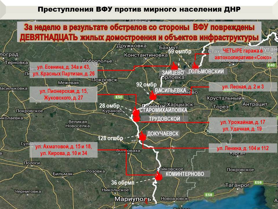 В результате обстрелов ВСУ повреждено 19 жилых домостроений и объектов инфраструктуры в населенных пунктах: Гольмовский, Зайцево, Васильевка, Старомихайловка, Докучаевск, Коминтерново и поселка шахты «Трудовская» г. Донецка.